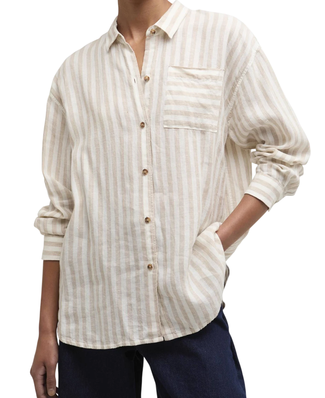 Het Barbour Annie Shirt Sand Stripe combineert lichtgewicht linnen met een tijdloos streepdesign en een comfortabele pasvorm.