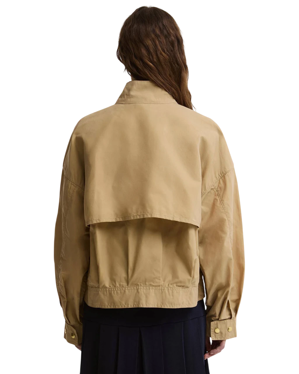 De jas is geïnspireerd op het klassieke Harrington- en blouson-silhouet, maar vertaald naar een moderne damesstijl met een kortere lengte en een relaxte pasvorm.