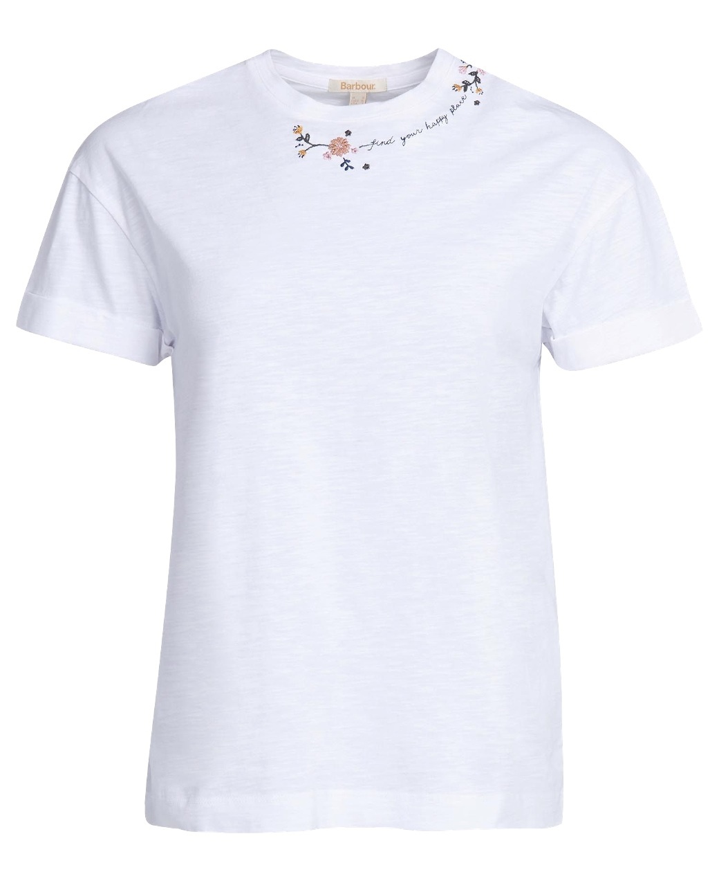 Het Barbour Cranmoor T-shirt voor dames heeft een ontwerp met korte mouwen en een klassieke ronde hals. Deze top is gemaakt van 100% katoen en heeft een subtiel borduurdetail langs de halslijn met de tekst 'Find Your Happy Place'.