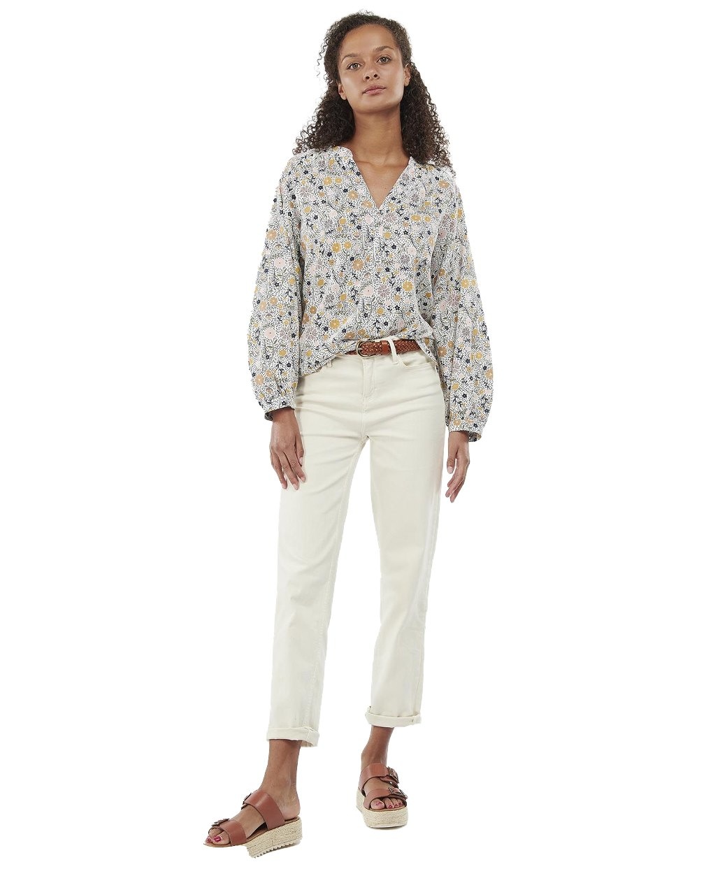 Barbour Melita Top dames blouse met florale print met plooitjes rond om de kraag en manchetten van de wijde driekwart mouwen.