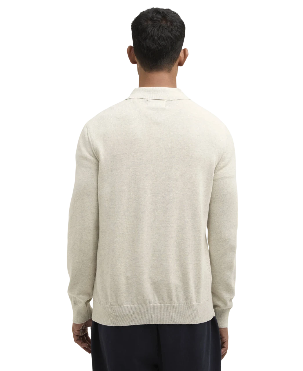 Een lichtgekleurde gebreide heren polo van premium Pima katoen.