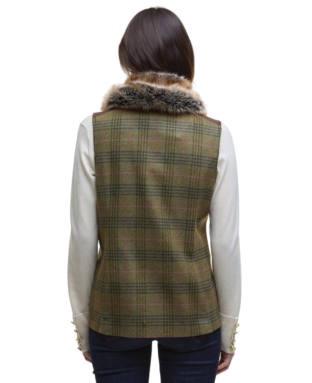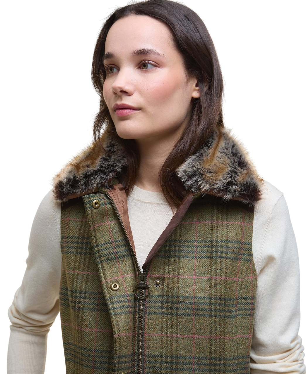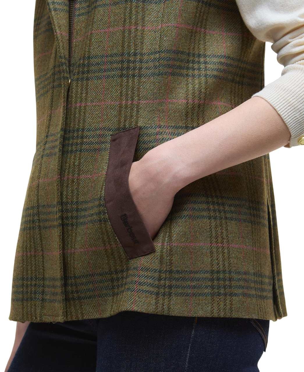 Barbour Rosemary Wool Gilet Arabesque/Brown een elegant wollen dames gilet met tartan tweed dessin, suedine schouderstukken en afneembare bontkraag. Perfect voor herfst, winter en stijlvolle outdoor momenten.