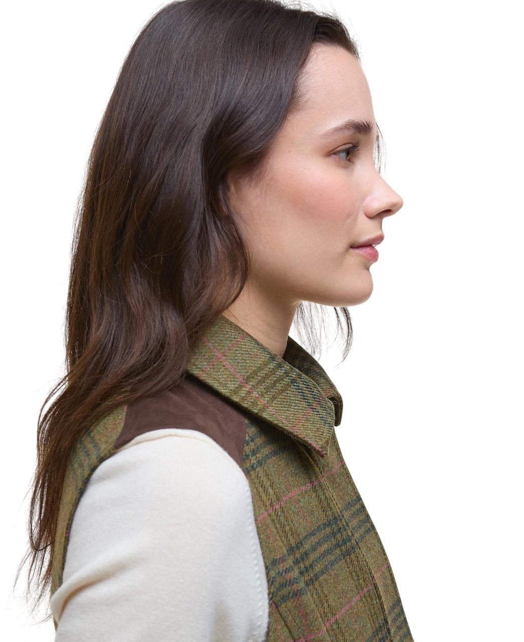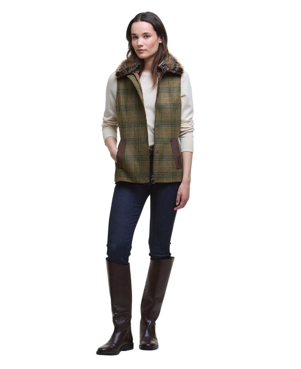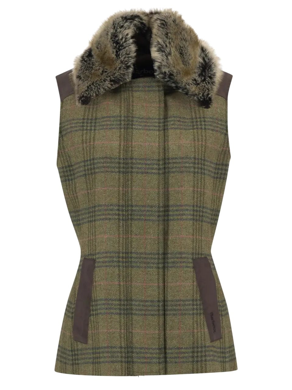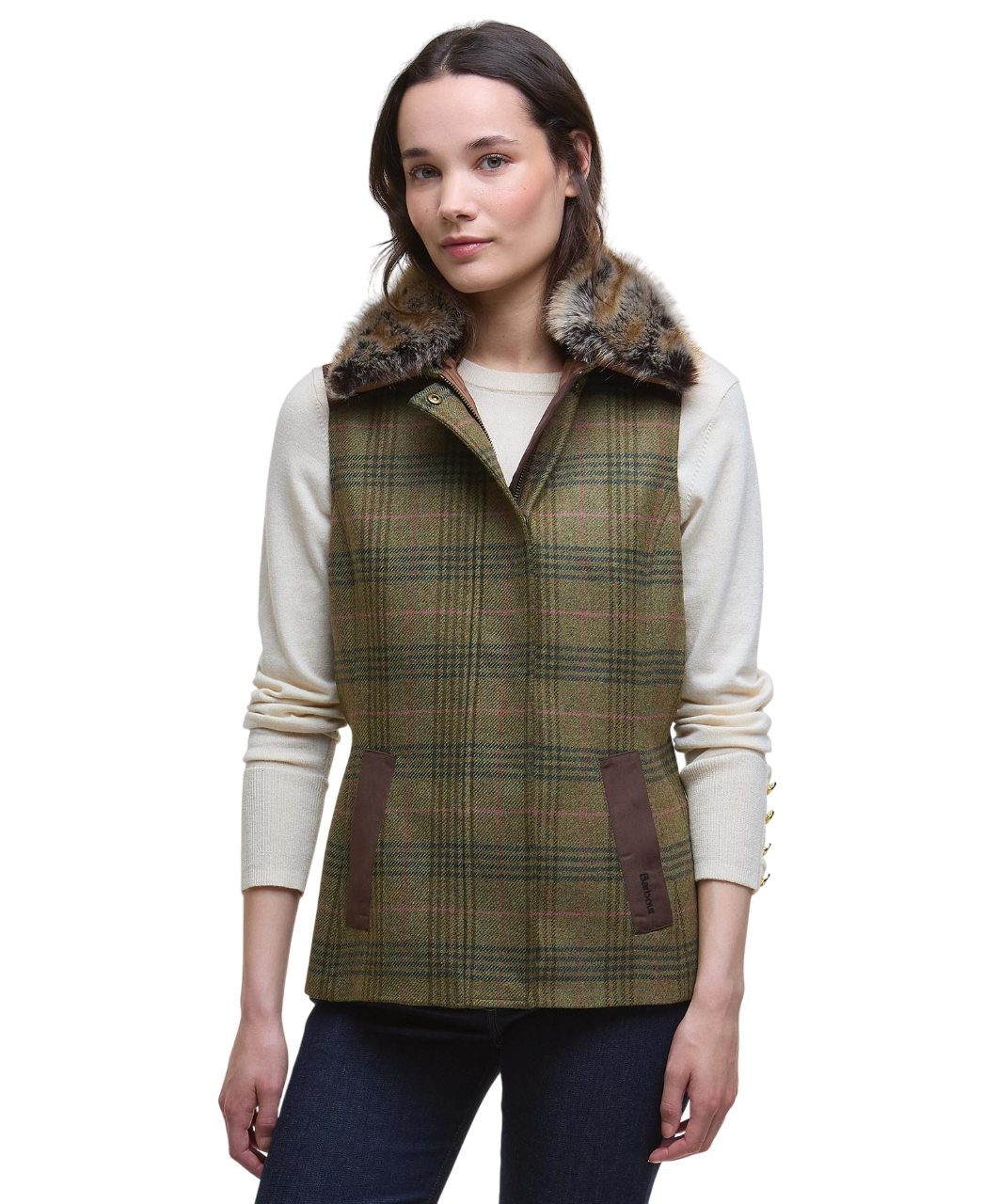 Barbour Rosemary Wool Gilet Arabesque/Brown een elegant wollen dames gilet met tartan tweed dessin, suedine schouderstukken en afneembare bontkraag. Perfect voor herfst, winter en stijlvolle outdoor momenten.