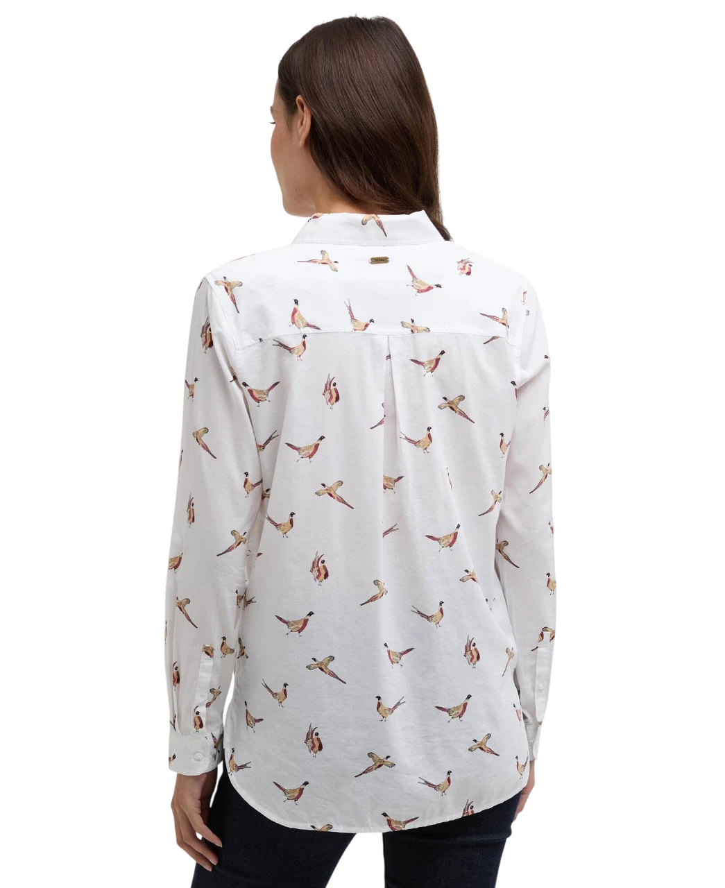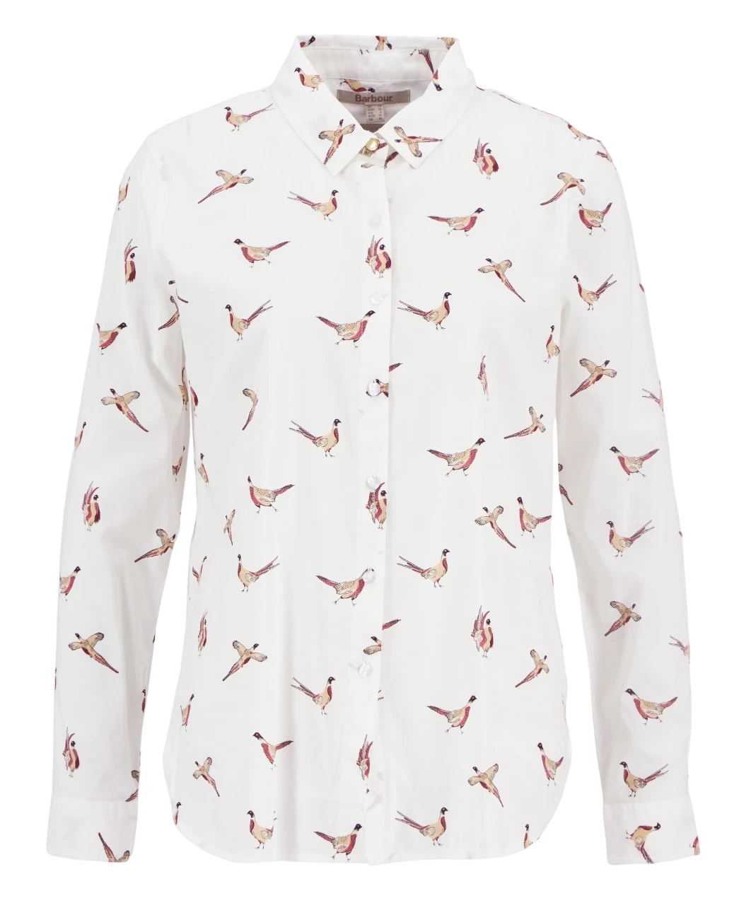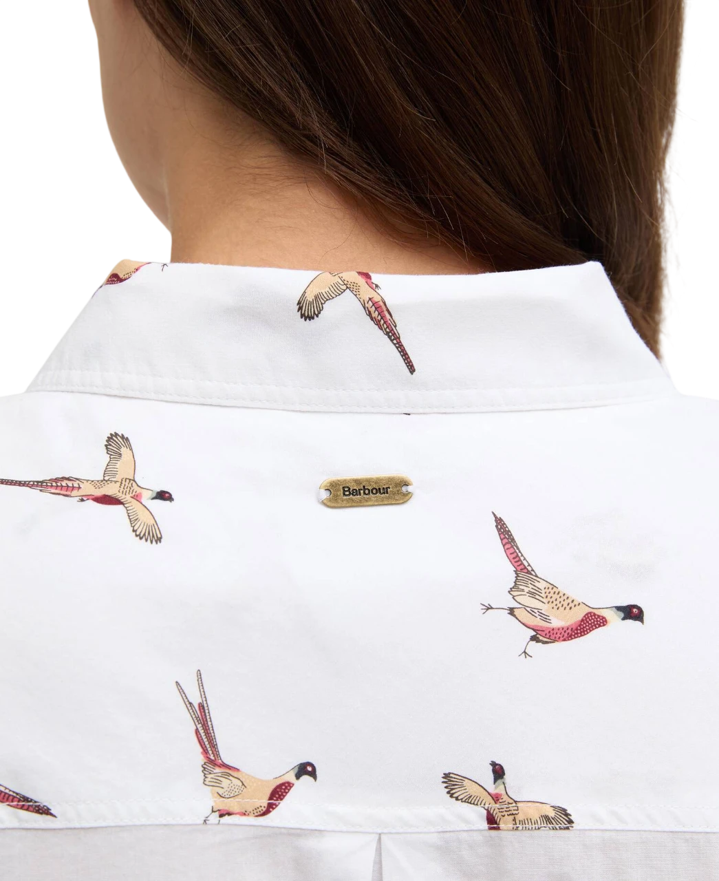 De fazant is een klassiek symbool van het Britse platteland en sluit perfect aan bij Barbours outdoor-traditie. De print is subtiel over het hele shirt verwerkt en geeft een speelse, vrouwelijke uitstraling zonder te overheersen.
