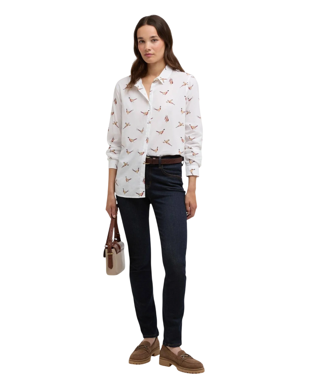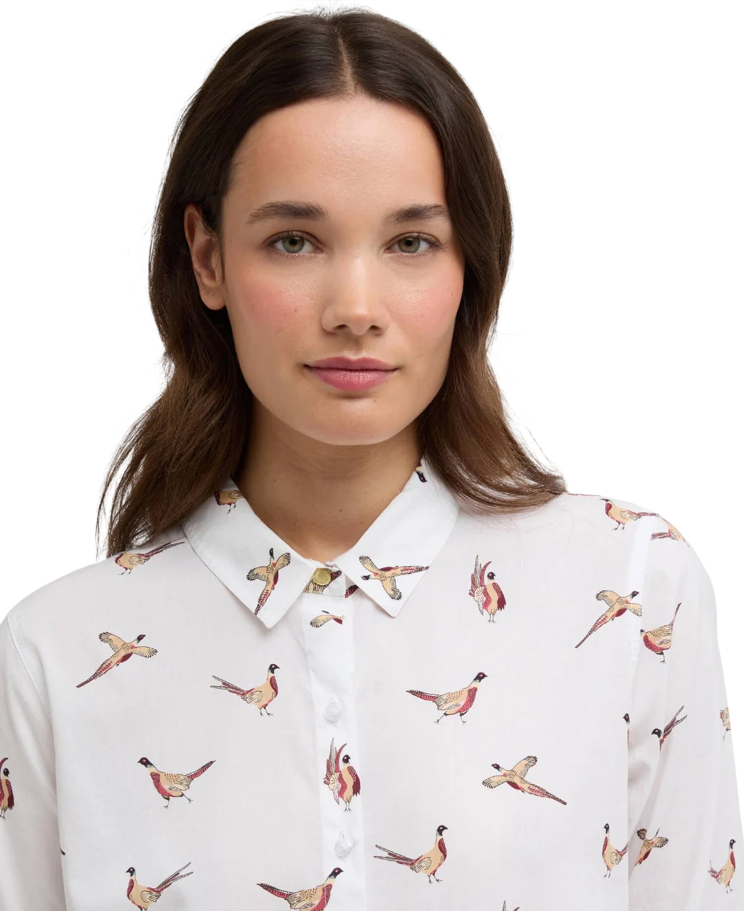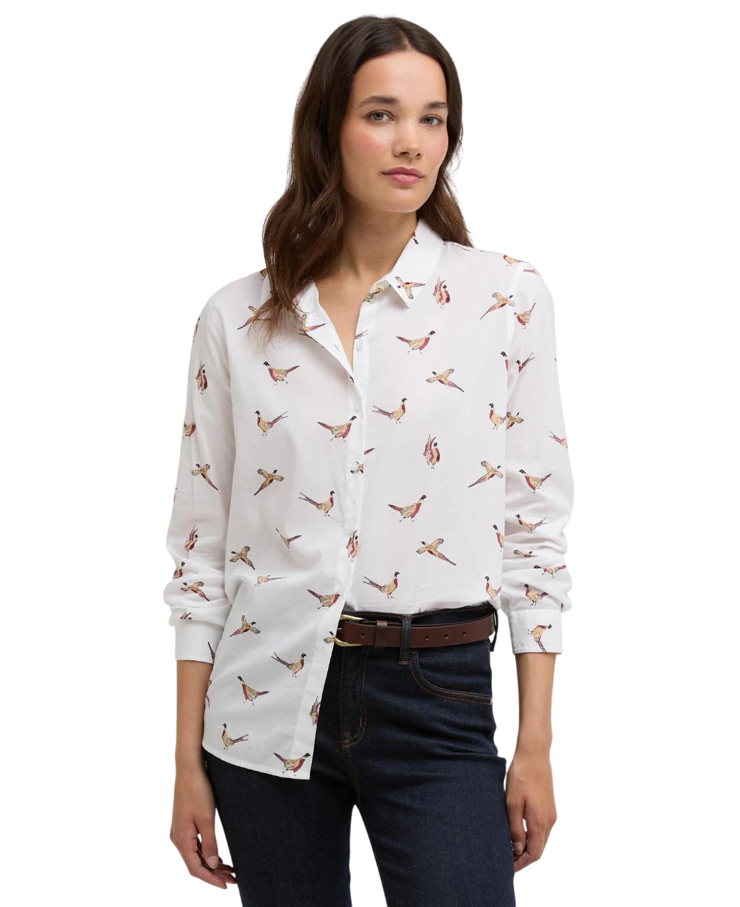 De fazant is een klassiek symbool van het Britse platteland en sluit perfect aan bij Barbours outdoor-traditie. De print is subtiel over het hele shirt verwerkt en geeft een speelse, vrouwelijke uitstraling zonder te overheersen.