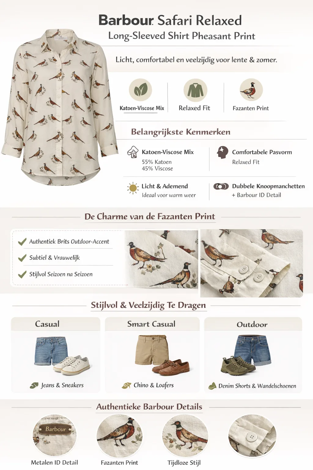 Het Barbour Safari Relaxed Long-Sleeved Shirt Pheasant Print is de perfecte keuze voor vrouwen die een casual, elegante en veelzijdige lente- of zomerlook willen.