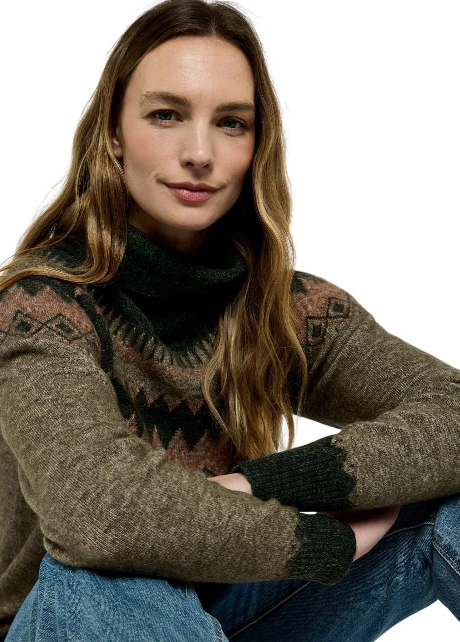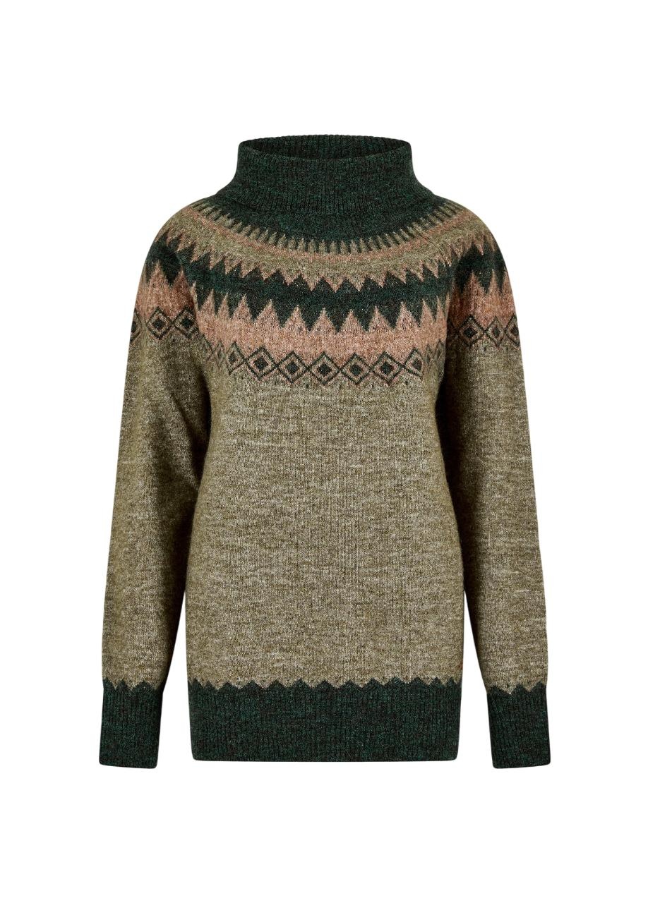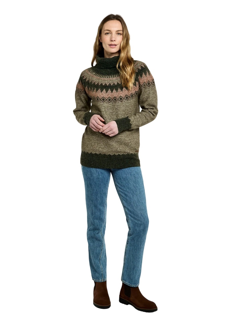 Dubarry Devlin Dames Fair Isle Coltrui - Olive – zachte alpacamix, warm, stijlvol en RWS-gecertificeerd. Shop nu jouw perfecte coltrui!